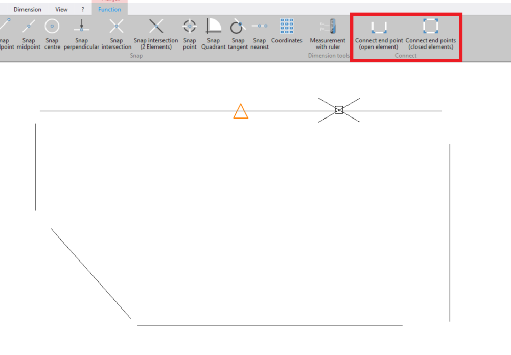 - Press the ‘Connect last lines’ button, located on the ‘Change’ tab. Follow the prompts to choose between open or closed element.
