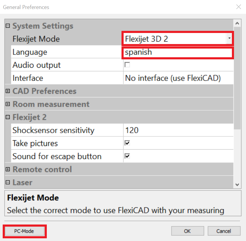 - Se abrirá el panel de preferencias generales. Si se conecta a Flexijet 3D, asegúrese de que en la casilla de “Flexijet Mode” este seleccionado: “Flexijet 3D 2”. Aquí mismo también podrá cambiar el idioma de Flexijet Stone y de igual manera elegir entre Modo PC y Modo Táctil En la parte inferior.
