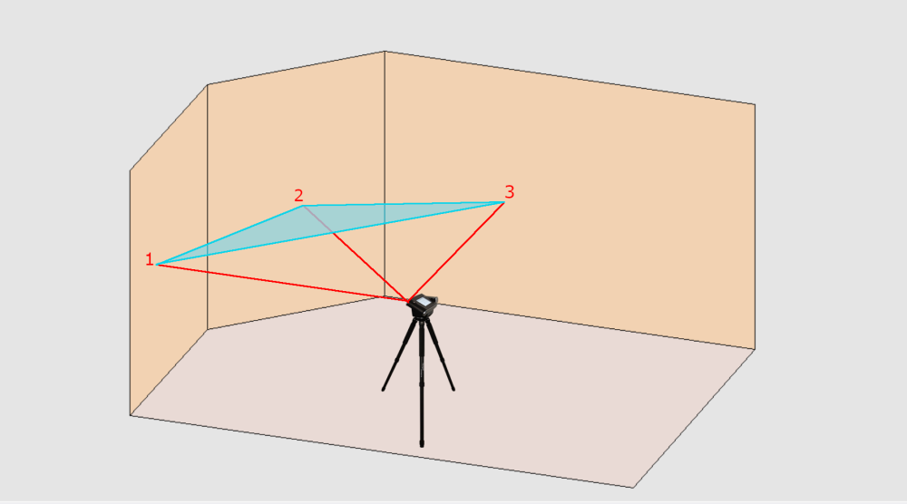- Siga las instrucciones del comando, mida 3 puntos horizontales. Asegúrate de que los puntos medidos forman un gran triángulo, por ejemplo, un punto en la pared izquierda, un punto en la pared frontal y un punto en la pared derecha como se muestra en la imagen.