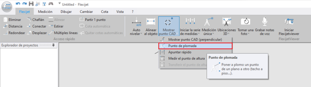 - Seleccione la función Punto de Plomada, que se encuentra en la pestaña de Flexijet debajo de “Mostrar punto CAD”.