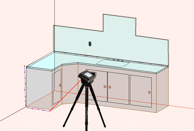 A waterfall can be measured from the same position as the countertop if Flexijet is able to measure the required points from its position. If not, you must reposition Flexijet and continue measuring in the same drawing. Use Repositioning (3D Locations).