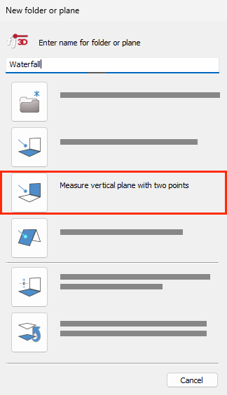 - To create an additional waterfall folder, select the ‘New Folder’ function and set the ‘Vertical Plane’ by either clicking or measuring the corresponding left and right points for the next waterfall.