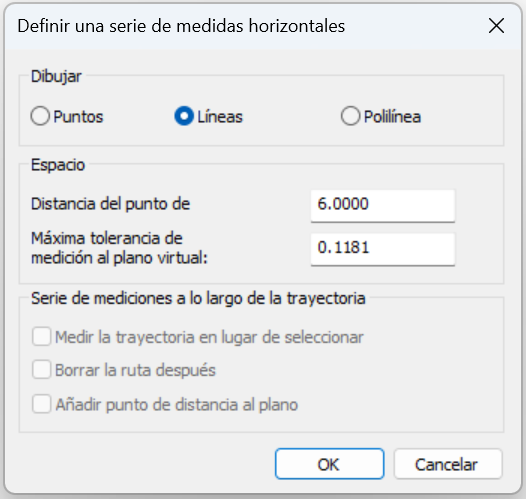 - Se abrirá una ventana Definir serie de Medidas. Puede elegir entre dibujar Puntos, Líneas o Polilíneas. Introduzca la ‘distancia entre puntos’, o la distancia entre cada punto consecutivo a medir. La última opción, ‘Tolerancia máxima de medición al plano virtual’ le permite definir la tolerancia de distancia al plano horizontal virtual en el que se tomarán las mediciones.