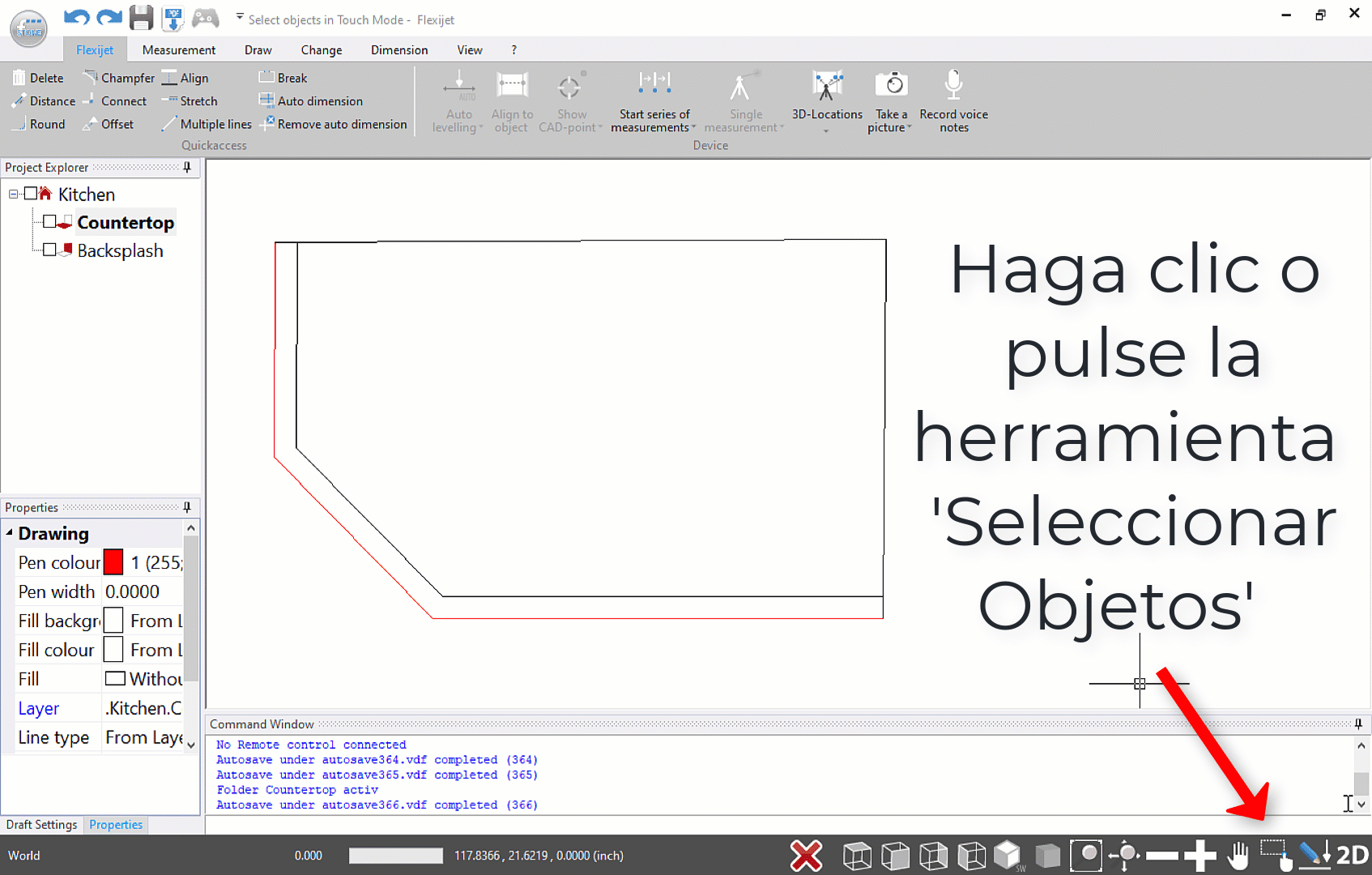 Tenga en cuenta que el botón dice la opción que se va a seleccionar cuando se toca. Por lo tanto, si el botóndice ‘Touch-mode’, entonces FlexiCAD está actualmente en Modo PC. Si el botón dice Modo PC, entonces el software está actualmente en Modo Táctil.