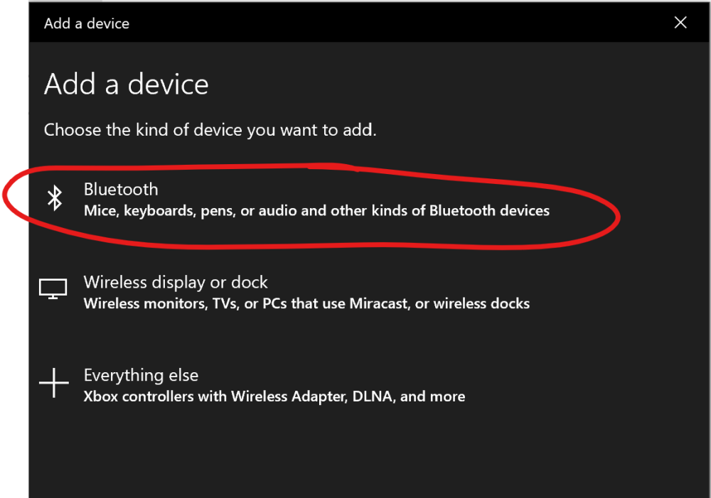 - 选择’Bluetooth – Mice, keyboards, pens, or audio and other kinds of Bluetooth devices 蓝牙–鼠标、键盘、笔、音频和其他类型的蓝牙设备’。