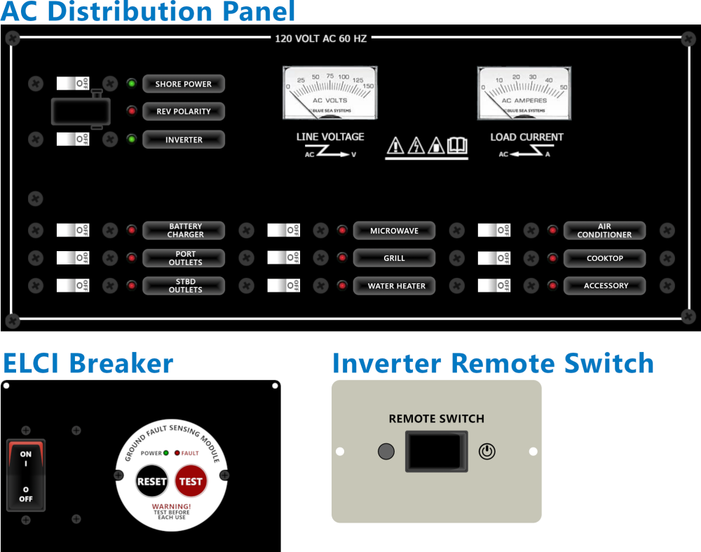 The ELCI Breaker, Remote Switch, and AC Distribution panel are located in the mid-berth. Your AC Distribution Panel may have empty/inactive breakers depending on your selected boat options.