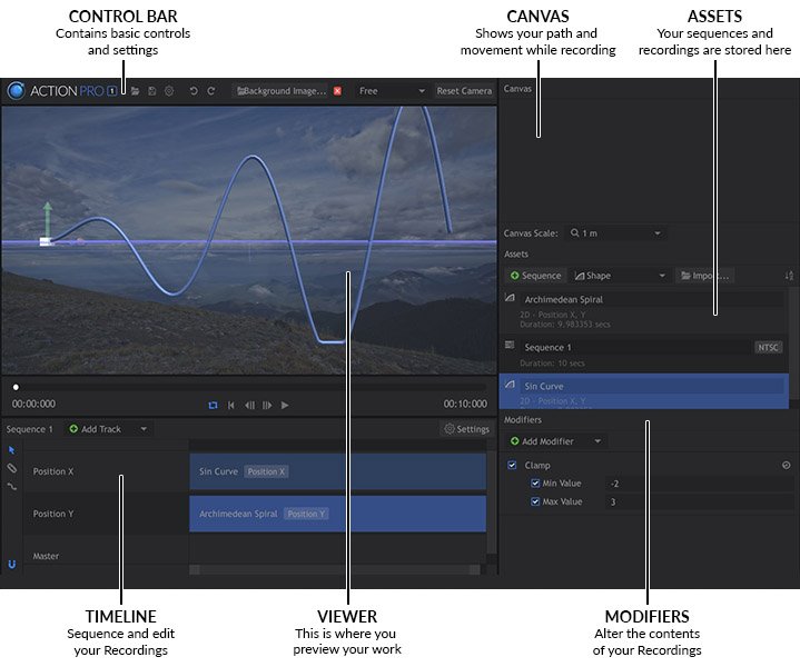 The Action Pro interface is comprised of six main sections, as labeled in this image.