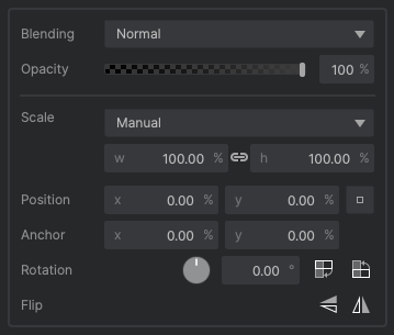 The Transform controls for a layer allow you to manipulate the size and shape of the layer, and how it is combined with the other layers in your project. Each kind of layer has its own unique set of transform controls, though there is some overlap in the controls between layer kinds.