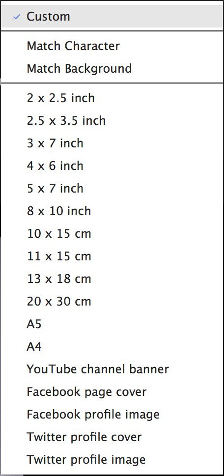 Use the Dimensions menu to select a specific size preset. If you want to dial in a custom size, select the Custom option and then enter the width and height, in pixels, that you require. The listed presets cover the majority of common and popular image sizes, and the Custom option will work for any sizes not available as presets.
