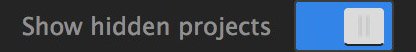 Toggle the Show hidden projects option on or off to show or hide any projects that are Hidden. When the toggle is blue, all projects will appear in the list, whether they are hidden or not. When the toggle is gray, hidden projects will not appear in the project list.