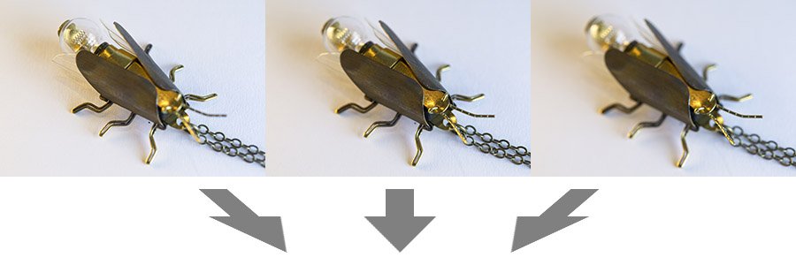 In this product shot of a firefly pendant, It is not possible to get the bulb in focus at the same time as the head, in a single exposure: