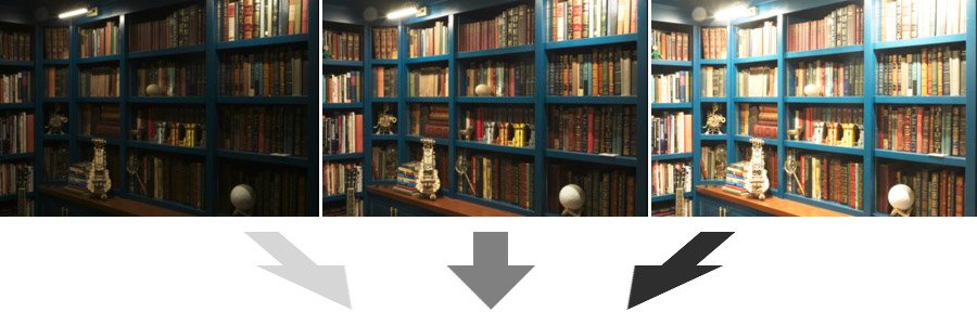 For example, the lighting in this library is much brighter on the top shelves than the lower shelves. As a result, trying to capture the scene in a single exposure means that some areas are too bright, while other areas are too darkly shadowed to read the book titles: