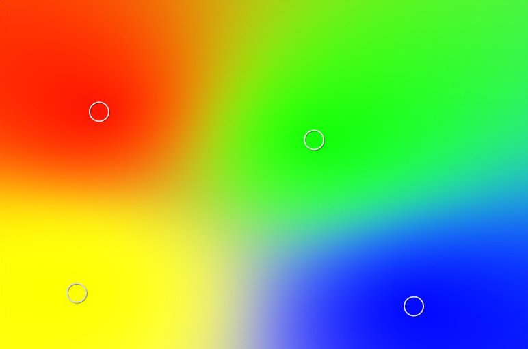 Creates a complex non-linear gradient of as many colors as you want. You can click anywhere on the canvas to add a new point, and assign each point any color you like, and Imerge will create transitional gradients between all points.