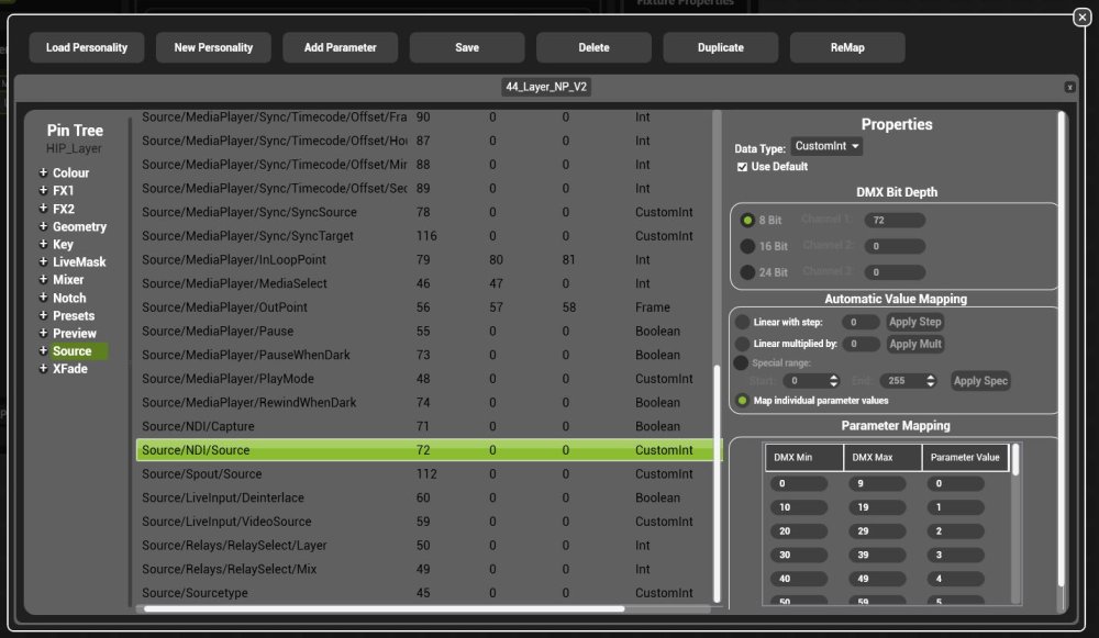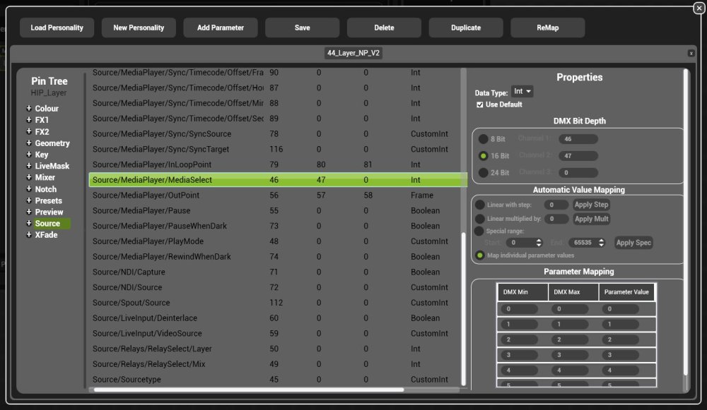 Despite being a single parameter in Hippotizer, the 16 bit integer mapping is frequently addressed as two different channels by lighting desks. The first channel works out to a bank select, while the 2nd channel is the clip select.