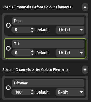 Special Channels are spacers in the channel layout of the fixture. In the above example, the personality would leave 4 channels empty (2 × 16bit channels) before the colour information and 1 channel empty after the colour information. This is frequently used to patch moving lights or LED fixtures that have macro or strobe channels.
