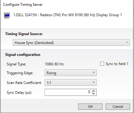 - Click the Configure button next to the Timing Server drop down. Then set the Timing Signal Source to House Sync (Genlocked) and click OK