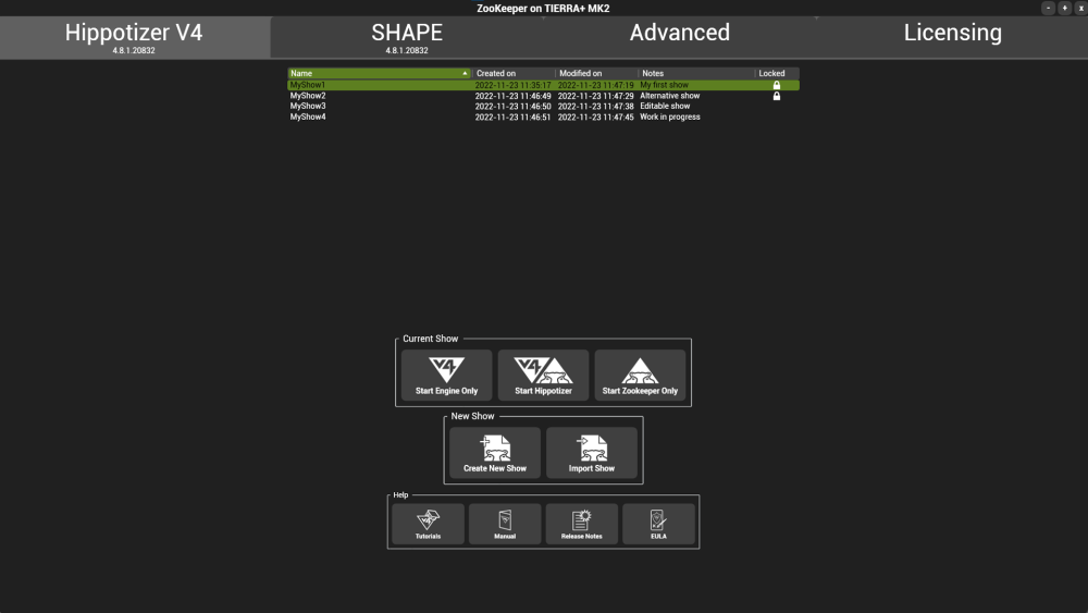 The show manager is where a user can select from a list of Hippotizer instances for quick access to different show programming. You can add a show to the show manager list by selecting the ‘Create New Show’ button in the New Show section of the window. New shows can have a user defined name and description. Right clicking on a show within the list will open options for the selected show.