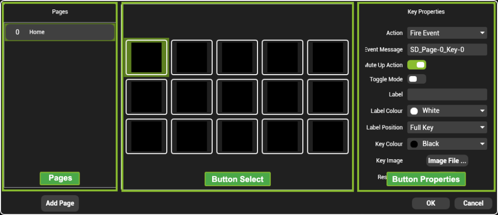 The Stream Deck configuration has three basic sections: