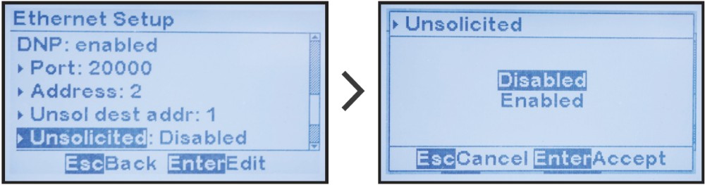 MENU > COMMUNICATION > “Ethernet setup” (as shown in Section 4.2) > “Unsolicited:” (located after “DNP: enabled”) > select “enabled” or “disabled”