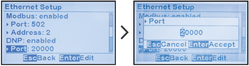 MENU > COMMUNICATION > “Ethernet setup” (as shown in Section 4.2) > “Port:” (located after “DNP: enabled”) > change digits