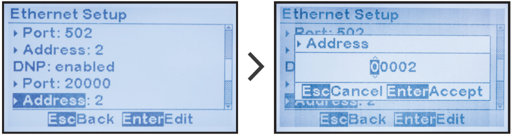MENU > COMMUNICATION > “Ethernet setup” (as shown in Section 4.2) > “Address:” (located after “DNP: enabled”) > change digits