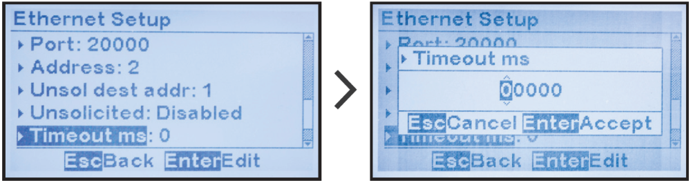 MENU > COMMUNICATION > “Ethernet setup” (as shown in Section 4.2) > “Timeout ms:” ( located after “DNP: enabled”) > change digits