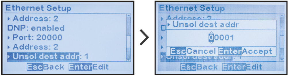 MENU > COMMUNICATION > “Ethernet setup” (as shown in Section 4.2) > “Unsol dest addr:” (located after “DNP: enabled”) > change digits