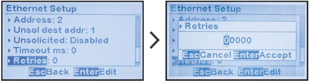MENU > COMMUNICATION > “Ethernet setup” as shown in Section 4.2) > “Retries:” ( located after “DNP: enabled”) > change digits