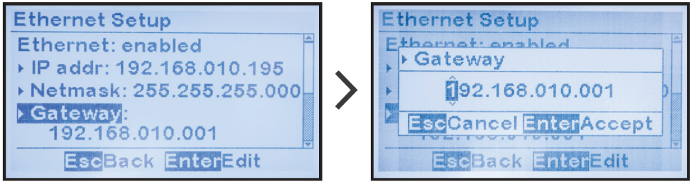 MENU (MENÚ) > COMMUNICATION (COMUNICACIÓN) > “Ethernet setup” (Ajuste de Ethernet) (tal como se muestra en la Sección 3.2) > “Gateway:” (Puerta de enlace:) > cambiar dígitos