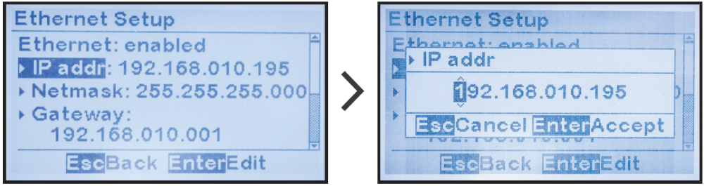 MENU (MENÚ) > COMMUNICATION (COMUNICACIÓN) > “Ethernet setup” (Ajuste de Ethernet) (tal como se muestra en la Sección 3.2) > “IP addr:” (Dir. IP:) > cambiar dígitos