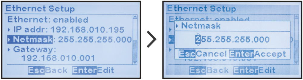 MENU (MENÚ) > COMMUNICATION (COMUNICACIÓN) > “Ethernet setup” (Ajuste de Ethernet) (tal como se muestra en la Sección 3.2) > “Netmask:” (Máscara de red:) > cambiar dígitos