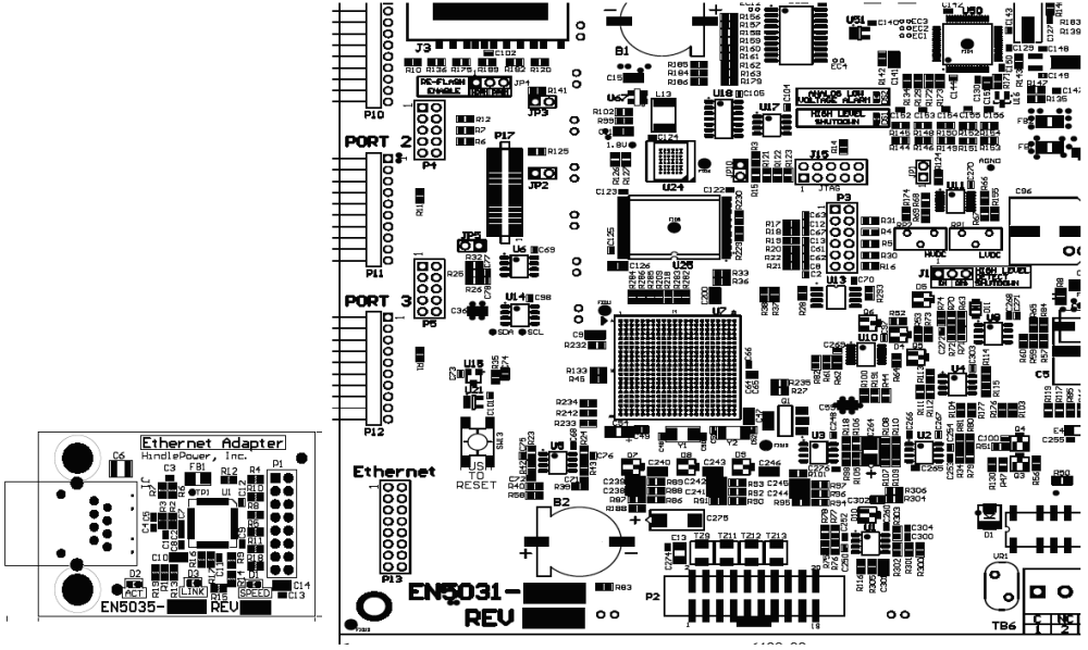 El adaptador de comunicación Ethernet (A22) se conecta al puerto “Ethernet” (P13), cerca de la parte inferior izquierda de la placa de control principal.