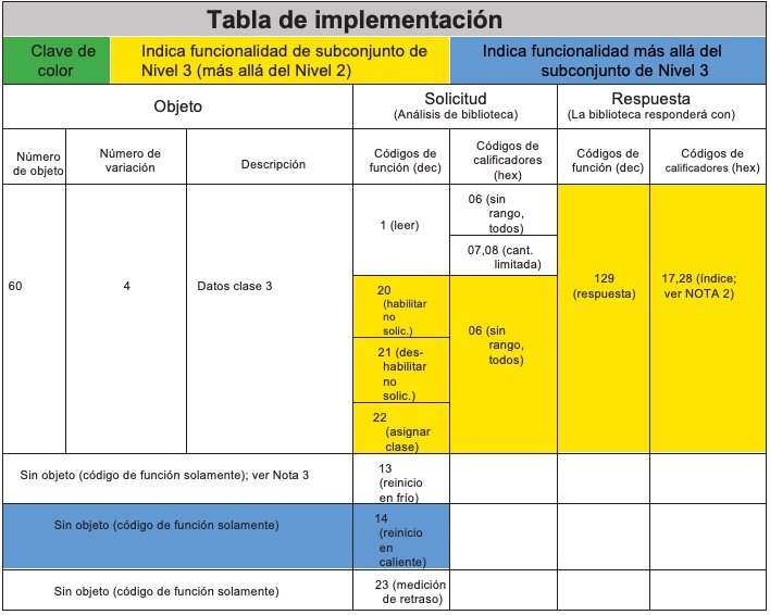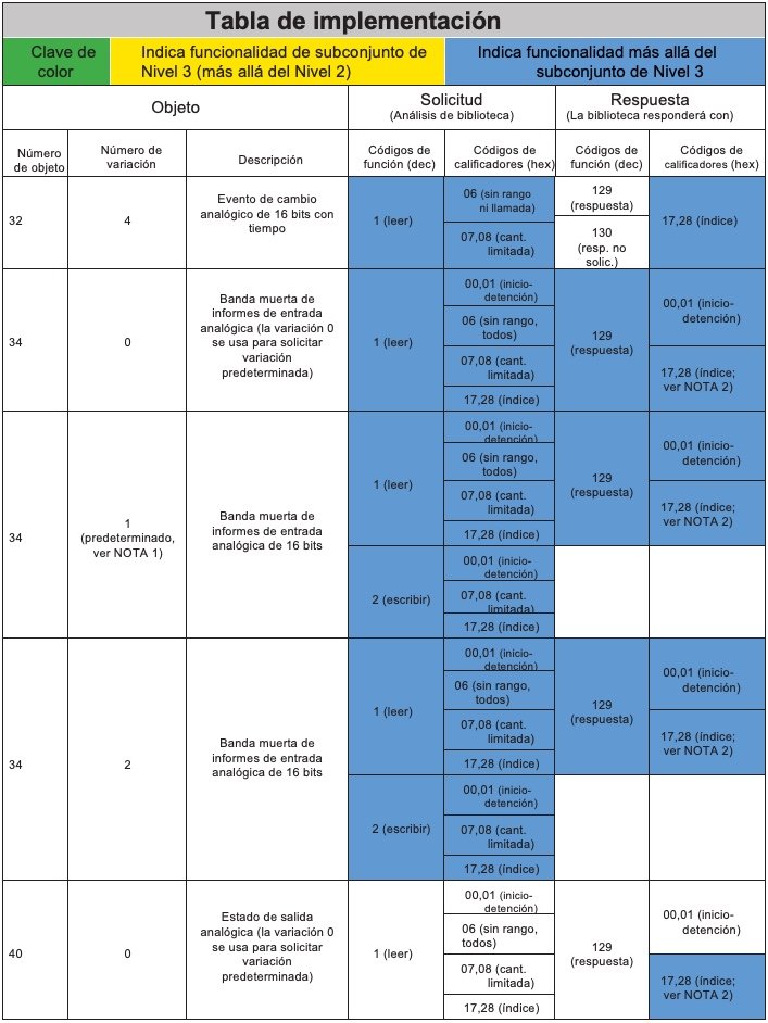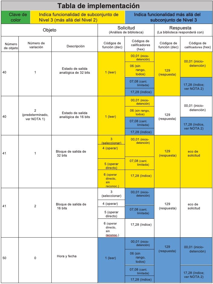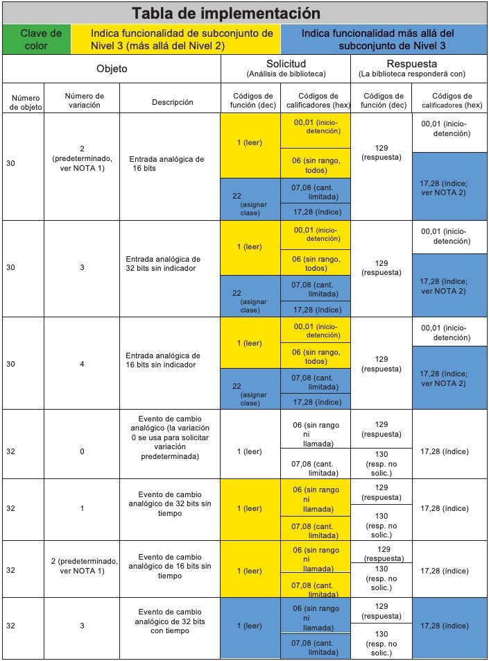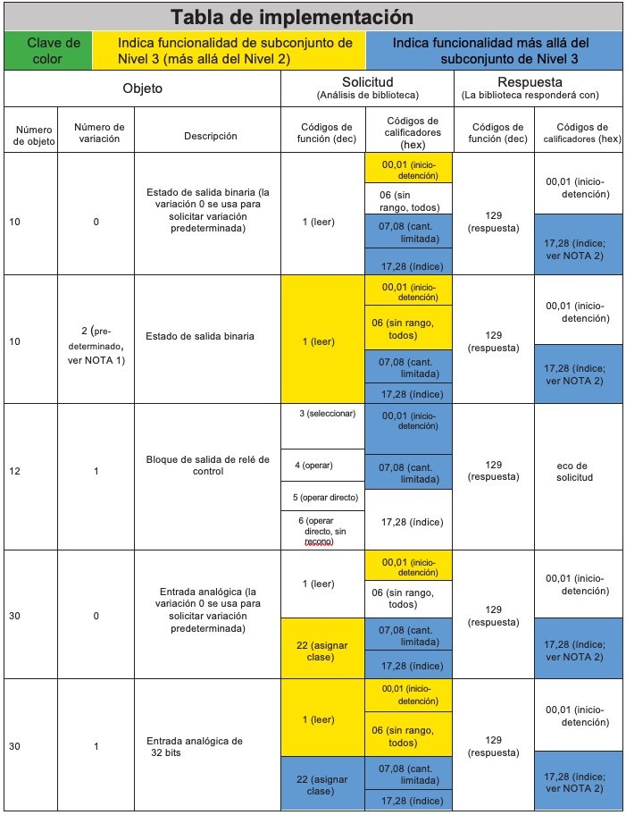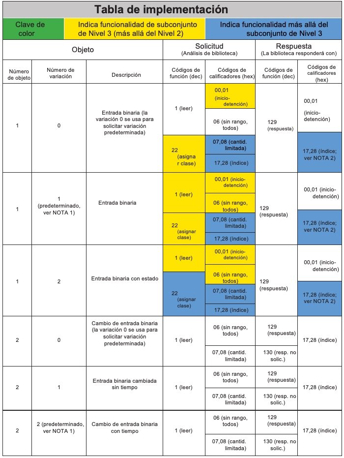 Nota 2: para objetos estáticos (sin evento de cambio), los calificadores 17 o 28 solo se responden cuando se envía una solicitud específica con los calificadores 17 o 28, respectivamente. De lo contrario, las solicitudes de objetos estáticos enviadas con los calificadores 00, 01, 06, 07 o 08 se responderán con los calificadores 00 o 01. Para objetos de eventos de cambio, los calificadores 17 o 28 siempre se responden, excepto para el objeto 70, que responde con el calificador 1B o 5B.