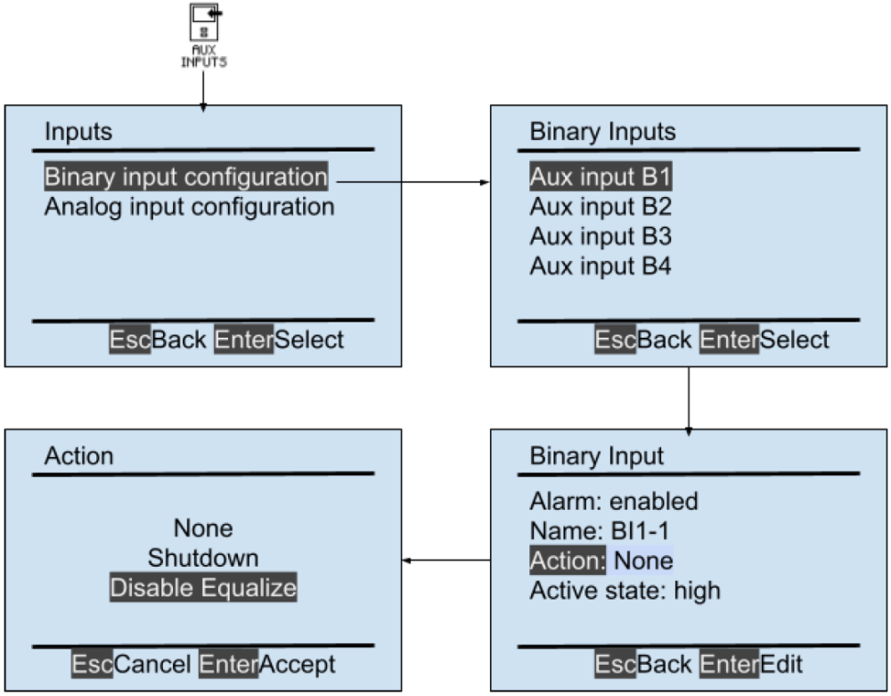 Disables the EQUALIZE output voltage mode which attempts to equalize the voltage among battery cells. This action can be triggered by either a binary or analog input. An example use-case for this feature would be when an aux input connected to a hydrogen sensor fires a 1% Hydrogen Alarm, this input can disable the EQUALIZE charging.