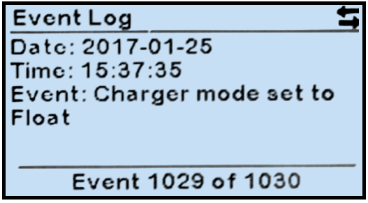 Pressing the EDIT/ENTER button will activate the feature or function selected onscreen. As an example, in the prior screenshot, ‘Event Logs’ was selected. Pressing EDIT/ENTER with this selection causes the following screen to open.