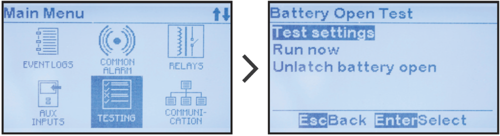 MENU > TESTING > ‘Test Settings’ (MENÚ > PRUEBA > ‘Ajustes de la prueba’)