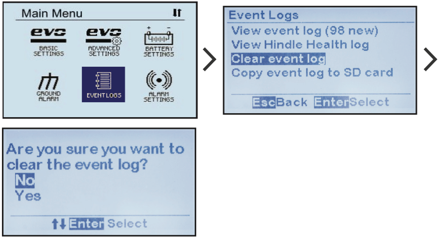 MENU > EVENT LOGS > ‘Clear event log’ > ‘Yes’ (MENÚ > REGISTROS DE EVENTOS > ‘Eliminar registro de eventos’ > ‘Sí’) para confirmar