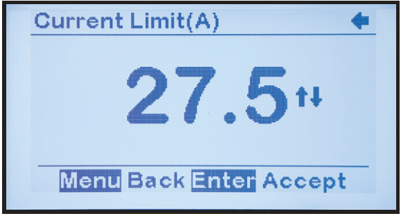 - Cuando termine de establecer el sexto parámetro (Current Limit [Límite de corriente]), presione EDIT/ENTER (Editar/Entrar) para guardar los ajustes y volver al funcionamiento normal.