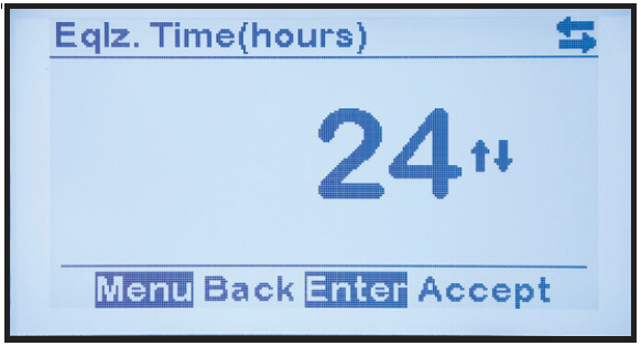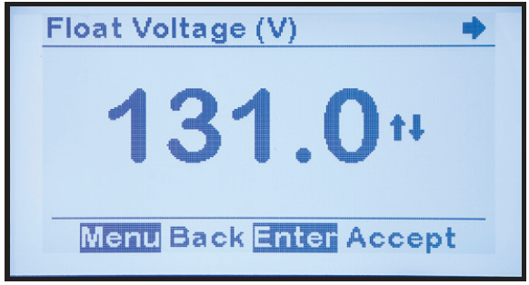 Cuando primero presiona EDIT/ENTER (Editar/Entrar) en el panel frontal, el equipo ATevo le indica que establezca los primeros seis (6) parámetros básicos del cargador (voltaje flotante). Una vez que haya hecho eso, presione EDIT/ENTER (Editar/Entrar) nuevamente, el siguiente parámetro aparecerá de manera automática. Continúe de esta manera hasta que haya establecido todos los parámetros.