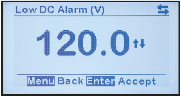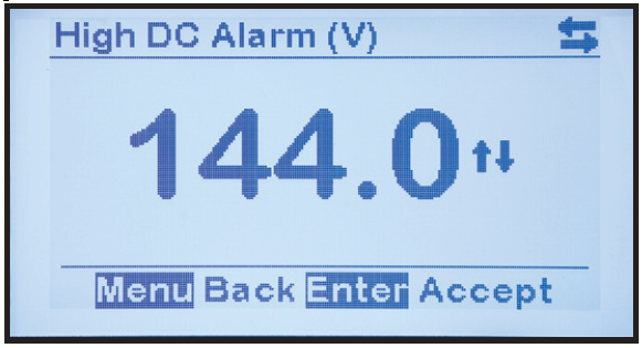- Presione UP (Arriba) o DOWN (Abajo) (o mantenga presionado para desplazarse) hasta que se muestre el valor deseado. Cada parámetro tiene un límite mínimo y máximo según se indica en la Sección 6.1.2: Tablas de ajustes de fábrica.