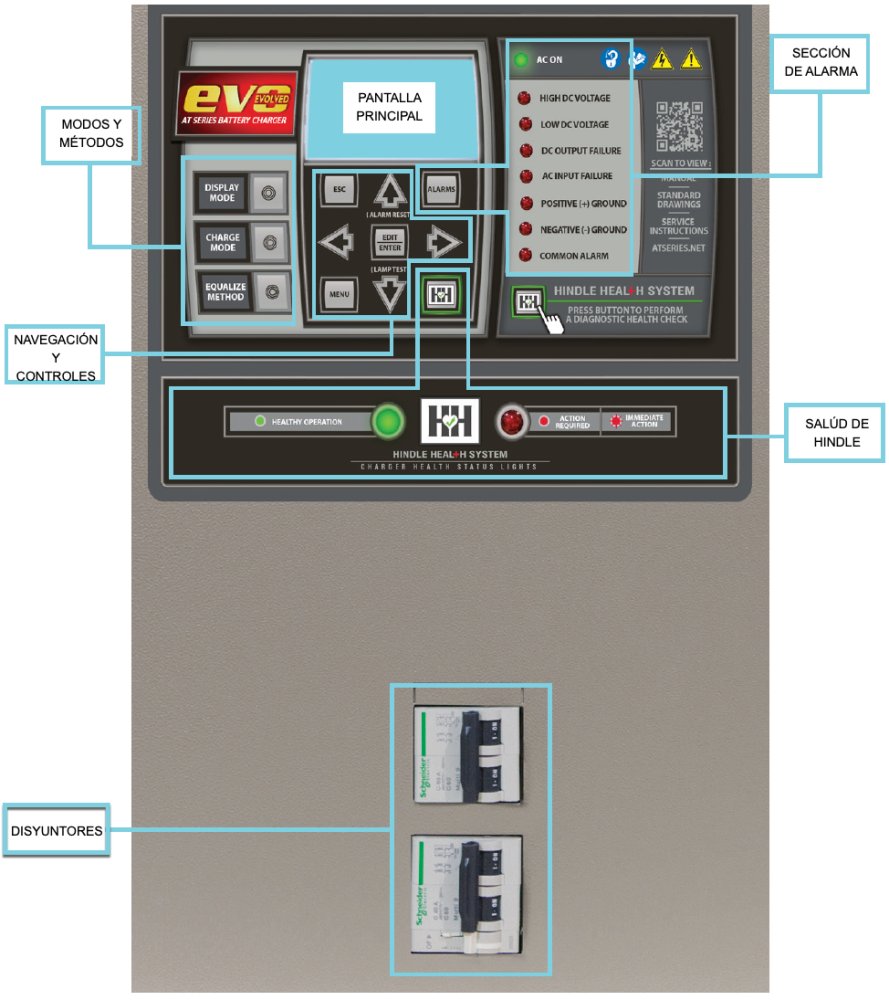 - El disyuntor de entrada de CA (CB1) se encuentra directamente abajo del panel de control frontal. Cuando se abre, el disyuntor de entrada desconecta de la fuente de CA todas las conexiones internas del equipo ATevo, excepto el terminal del disyuntor (CB1-L1/L2) donde se conecta la alimentación de entrada de CA. El disyuntor de salida de CC (CB2) se encuentra abajo del disyuntor de CA. Cuando se abre, el disyuntor de CC desconecta de la barra de bus de CC la salida del equipo ATevo.