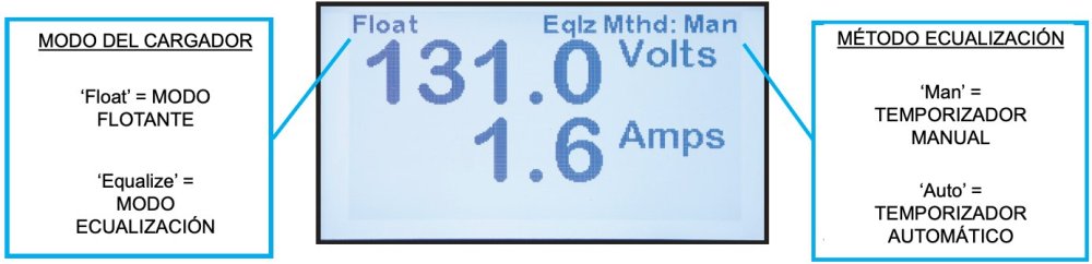 La pantalla HOME (Inicio) predeterminada aparece después del encendido y muestra el voltaje de la barra de bus de CC y la corriente CC del cargador, junto con el estado de CHARGER MODE (Modo del cargador) y EQUALIZE METHOD (Método de ecualización) en la línea superior. Los MODOS DE CARGA y los MÉTODOS DE ECUALIZACIÓN se describen en la Sección 7.1: Modos y métodos. El equipo ATevo volverá de forma automática a la pantalla HOME (Inicio) si no se presiona ningún botón durante diez (10) minutos, o si se presiona ESC (Escape) una o más veces. Cada vez que se presiona ESC (Escape), se retrocede un nivel hasta llegar a HOME (Inicio).