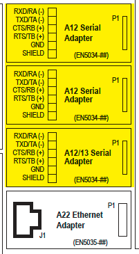 Shown above Ethernet Comm. Adapter (A22) on silkscreen. Up to three (3) Serial Communications Adapter boards (A12) can be plugged into the Main Control Board (A1) at locations P10, P11, and P12. This option supports DNP3 and Modbus protocols, and can be configured to support 2-wire or 4-wire RS-232 connections, or 2-wire or 4-wire RS-485 connections.