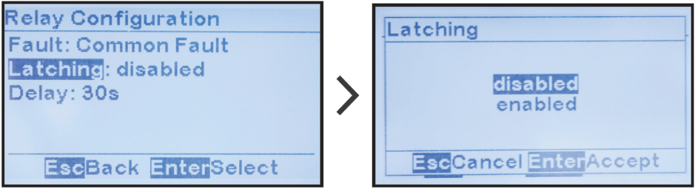 MENU > RELAYS > ‘Relay Configuration’ > select relay from options (refer to Section 12.4.1) > ‘Latching:’ > select from 2 latching options