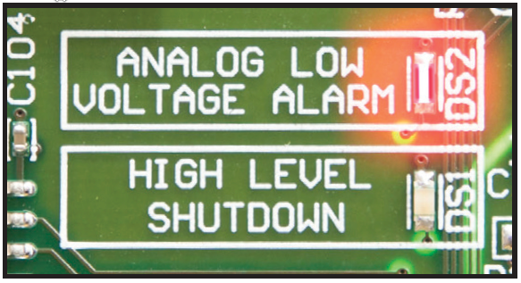- Esta alarma se activa cuando el voltaje de la barra de bus de CC detectado por la placa de control principal (A1) es más bajo que el punto de ajuste de detección de nivel bajo. Consulte la Sección 6.3 para obtener detalles. La función de detección de nivel bajo tiene un hardware exclusivo y funciona de manera independiente del control del microprocesador. La detección de nivel bajo es una función de protección contra fallas auténtica que activa el relé de alarma común en respuesta a una falla catastrófica, como una falla del microprocesador. El hardware de detección de nivel bajo iluminará un LED exclusivo ubicado en la placa de control principal (A1) cuando la alarma esté activa.