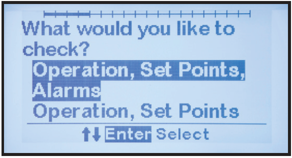 los relés:- Operation, Set points, Alarms (Funcionamiento, puntos de ajuste, alarmas)