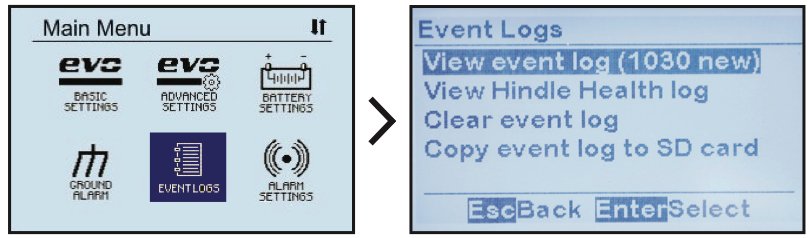 - Presione EDIT/ENTER (Editar/Entrar) para abrir la pantalla ‘Event Logs’ (Registros de eventos).