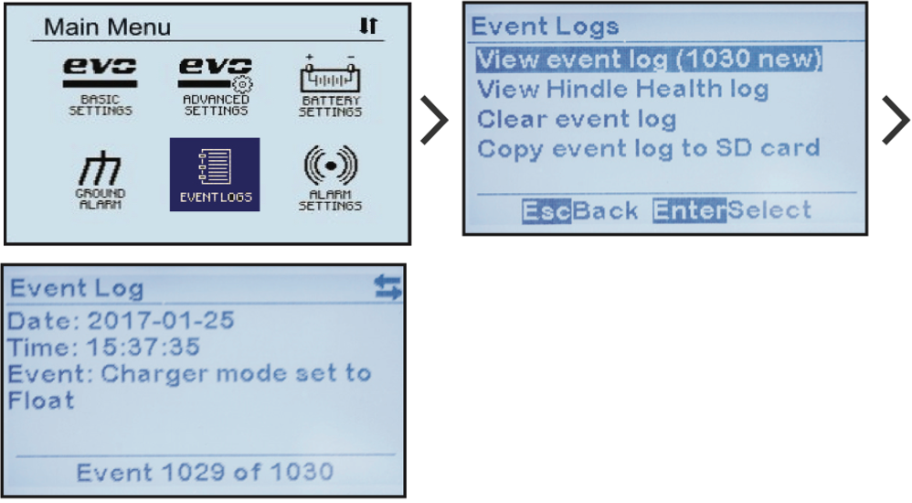 MENU > EVENT LOGS > ‘View event log (X)’ (MENÚ > REGISTROS DE EVENTOS > ‘Ver registro de eventos (X)’).