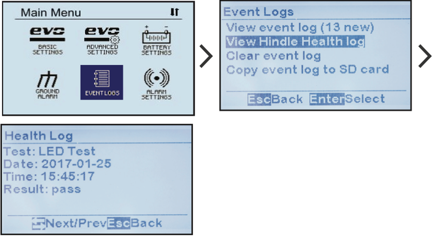 MENU > EVENT LOGS > ‘View Hindle Health log’ (MENÚ > REGISTROS DE EVENTOS > ‘Ver registro de salud Hindle’)
