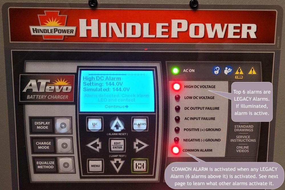 The Legacy Alarm group is a superset of the standard alarm group recommended by the NEMA-PE5 and IEEE standards for stationary battery chargers. These alarms have dedicated front panel LED indicators and are referred to as ‘legacy’ alarms since they have the same functionality as the standard alarms available on legacy AT10.1 and AT30 Series battery chargers.